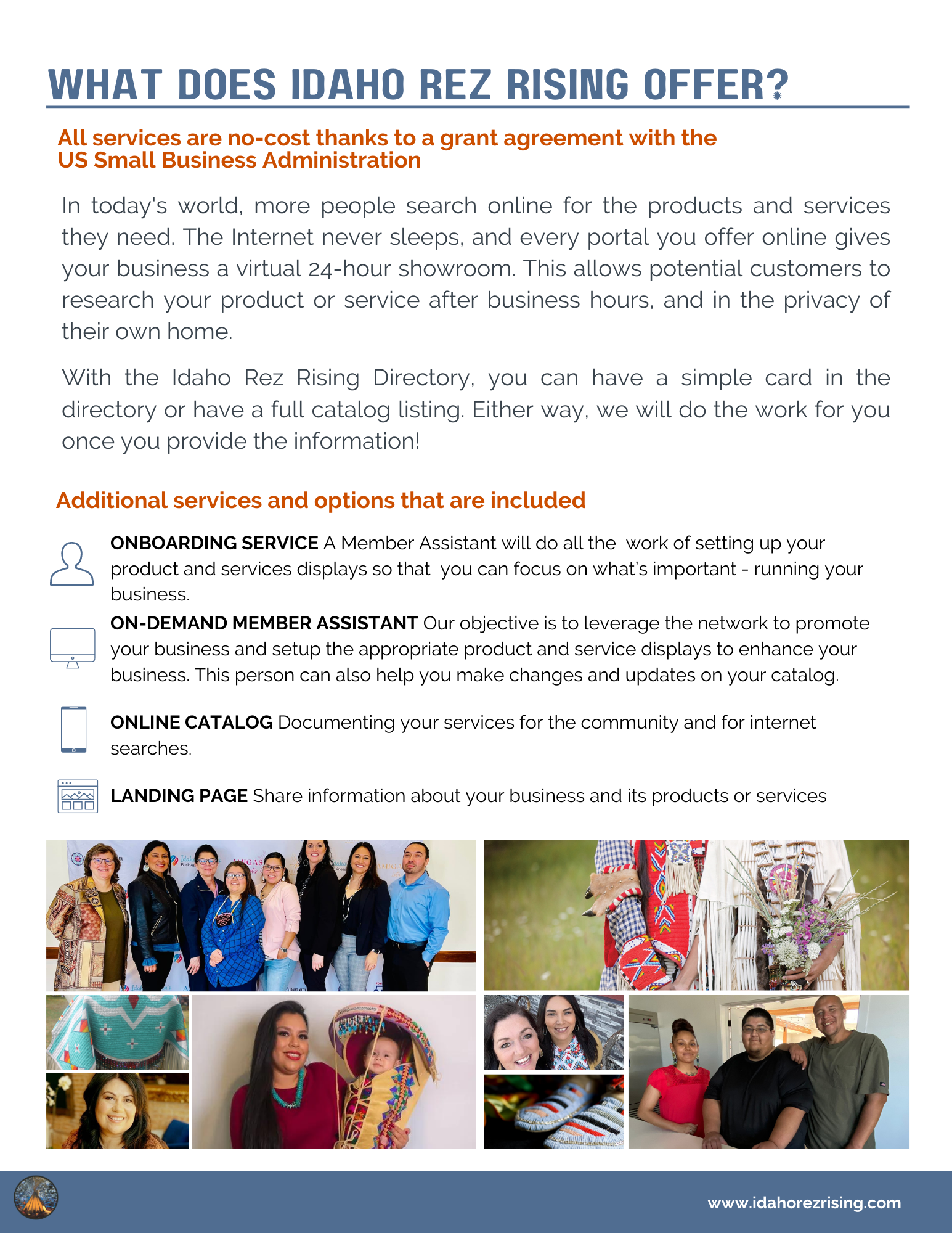 The team of Idaho Connect is dedicated to identify, engage and empower small business owners from various diverse communities, including a concerted effort to uplift Idaho Native American entrepreneurs. At Idaho Connect, we believe in the ingenuity and resilience of our Native communities, and choose to assist in the economic impact that Native Americans bring to Idaho. Idaho Rez Rising connects you with entrepreneurs in a digital way. Instant access to purchase goods or services such as beautiful jewelry, delicious food, or even a needed handyman. Creating an online component for a business presents new opportunities. Idaho Rez Rising is an exclusive online tool offering increased visibility to businesses.